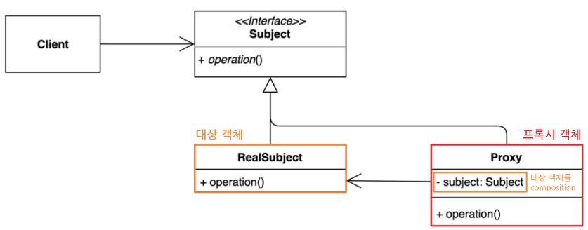 `Subject`: `RealSubject`와 `Proxy`를 하나로 묶는 인터페이스 (대상 객체와 프록시의 역할을 동일하게 하는 추상 메서드(operation())을 정의함)