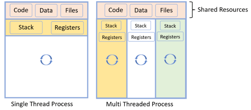 - 스레드는 프로세스 내에서 Code, Data, Heap 영역은 공유하며, Stack 영역만 각각 따로 할당받는다.