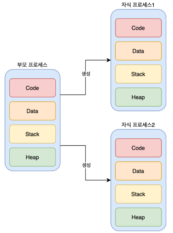 - 통신이 가능하지만, 부모 프로세스와 자식 프로세스는 독립적으로 실행되며, 독립적인 메모리 공간을 가지고 있어 서로 다른 작업을 수행한다.