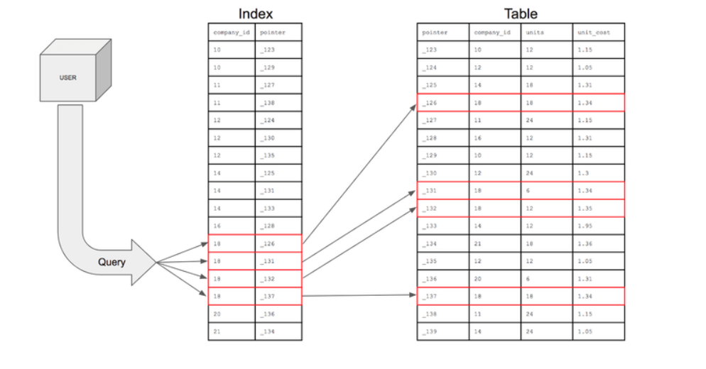 테이블의 특정 컬럼에 대해 인덱스를 생성하면, 해당 컬럼의 데이터를 정렬한 후, 별도의 메모리 공간에 데이터의 물리적 주소(pointer)와 함께 저장된다.