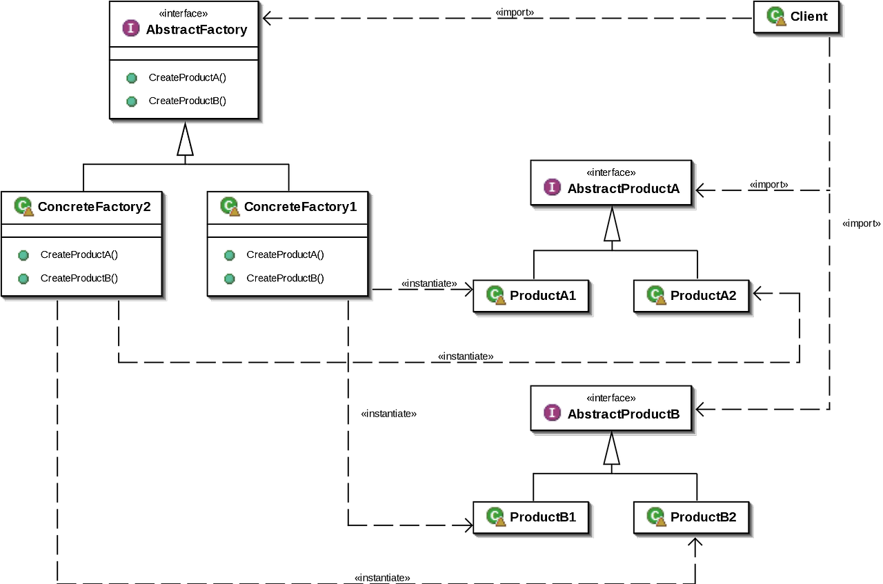 `AbstractFactory`: 최상위 공장 클래스로, 여러 개의 제품들을 생성하는 여러 메서드들을 추상화한다.
