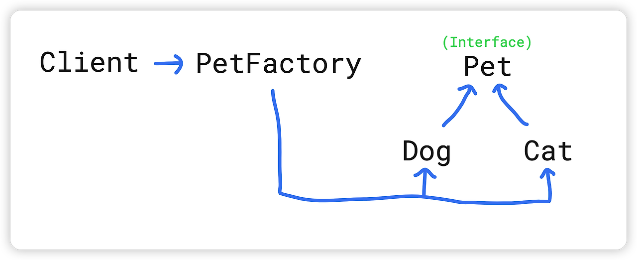 아래와 같이 PetFactory 클래스의 메서드를 통해, 특정 객체(`Cat`, `Dog` 등)를 생성할 수 있게 된다.